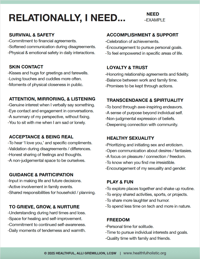 Here’s a 1-page PDF, inspired by the field of human development, designed to help you explore fundamental human needs, including examples of positive ways to express them within your relationships. Make it your own: